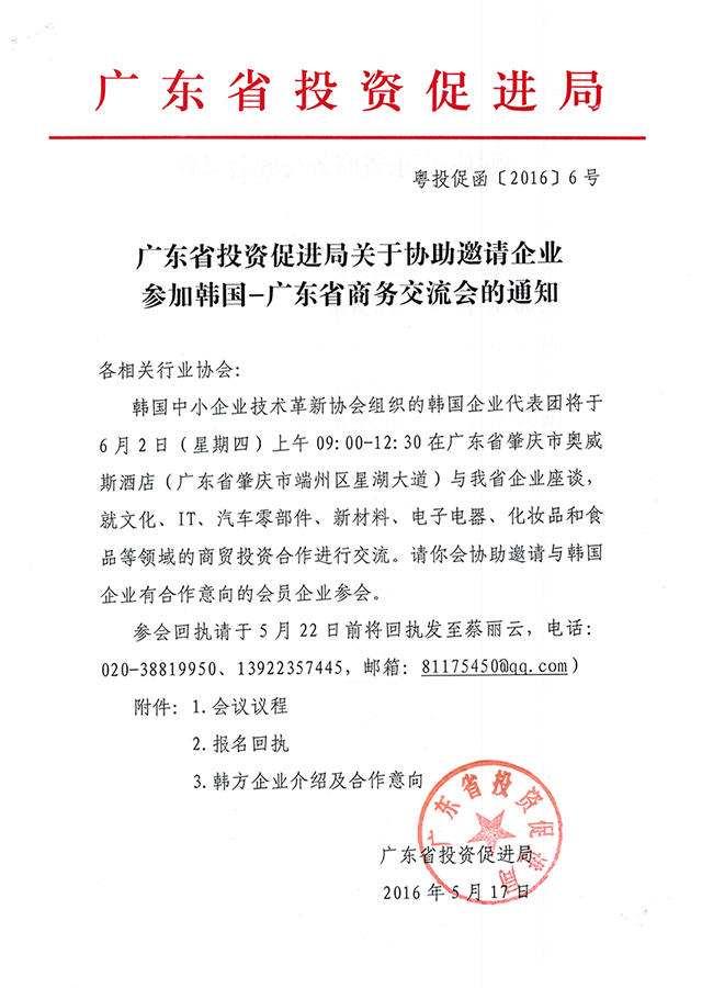 转发:广东省投资促进局关于协助邀请企业参加韩国-广东省商务交流会的通知