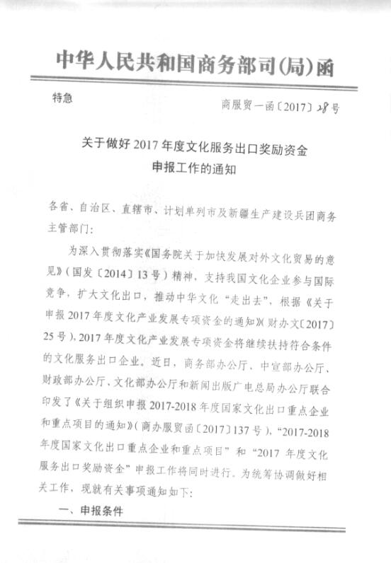 转发:关于做好2017年度文化服务出口奖励资金申报工作的通知