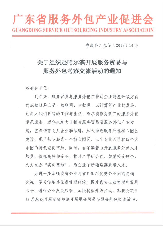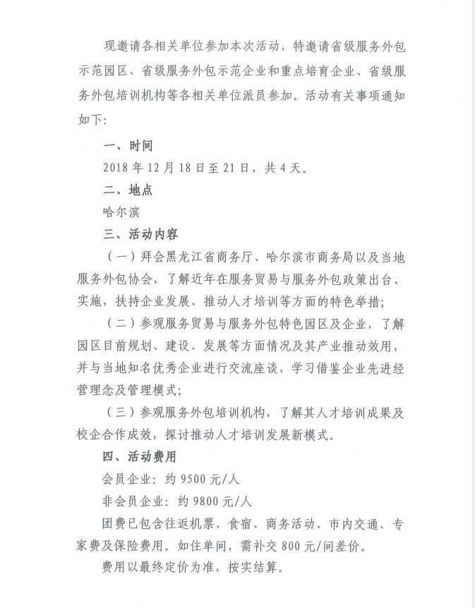 关于组织赴哈尔滨开展服务贸易与服务外包考察交流活动的通知