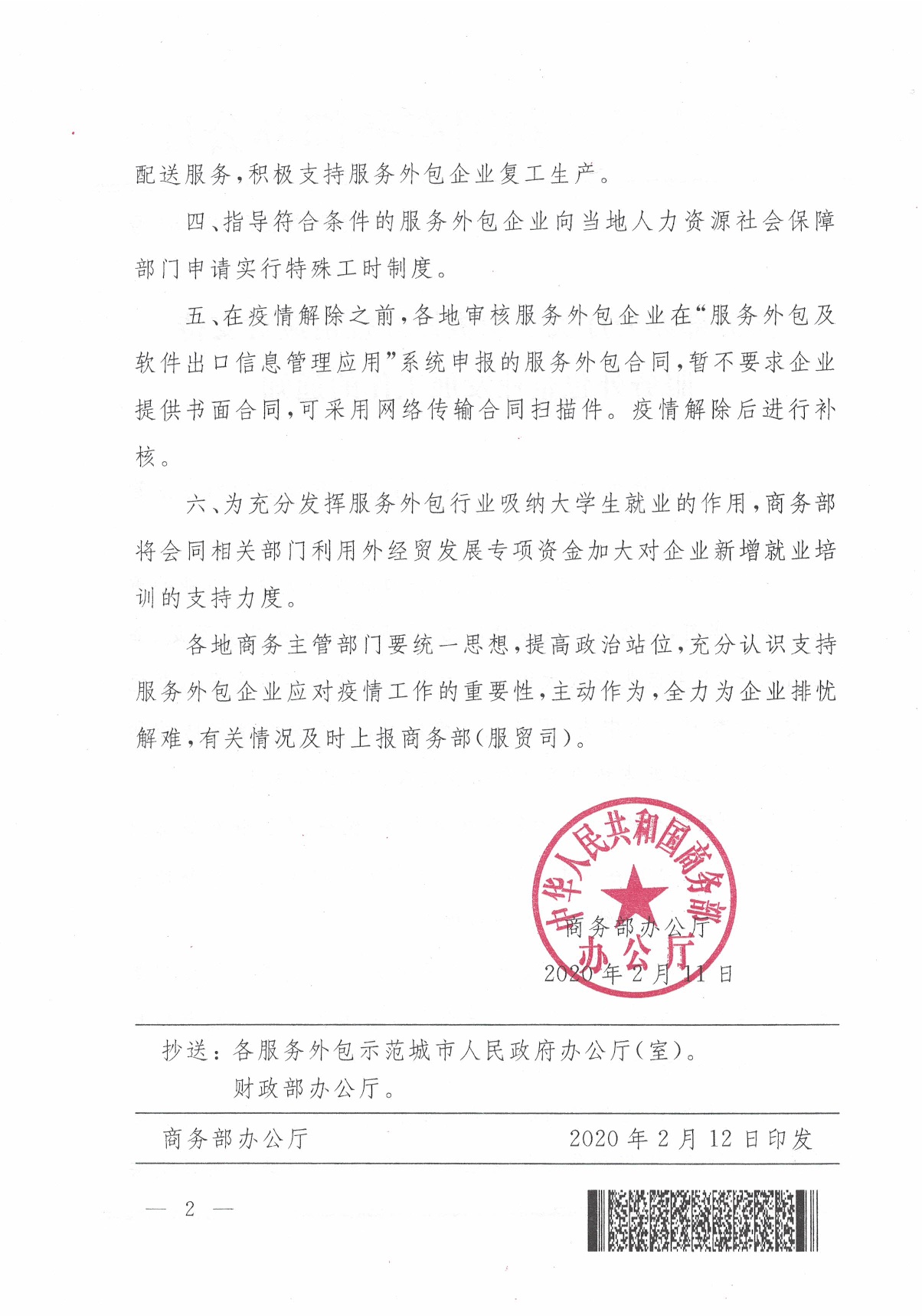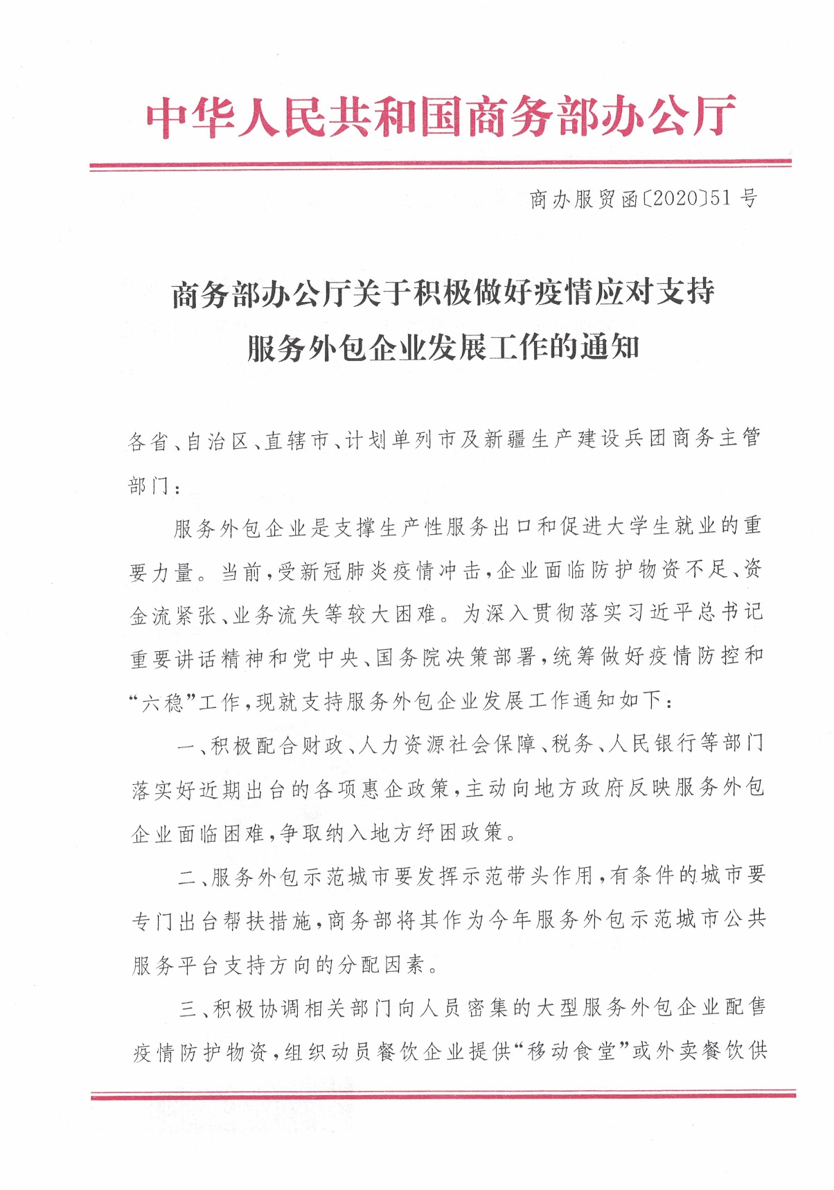 商务部办公厅关于积极做好疫情应对支持服务外包企业发展工作的通知