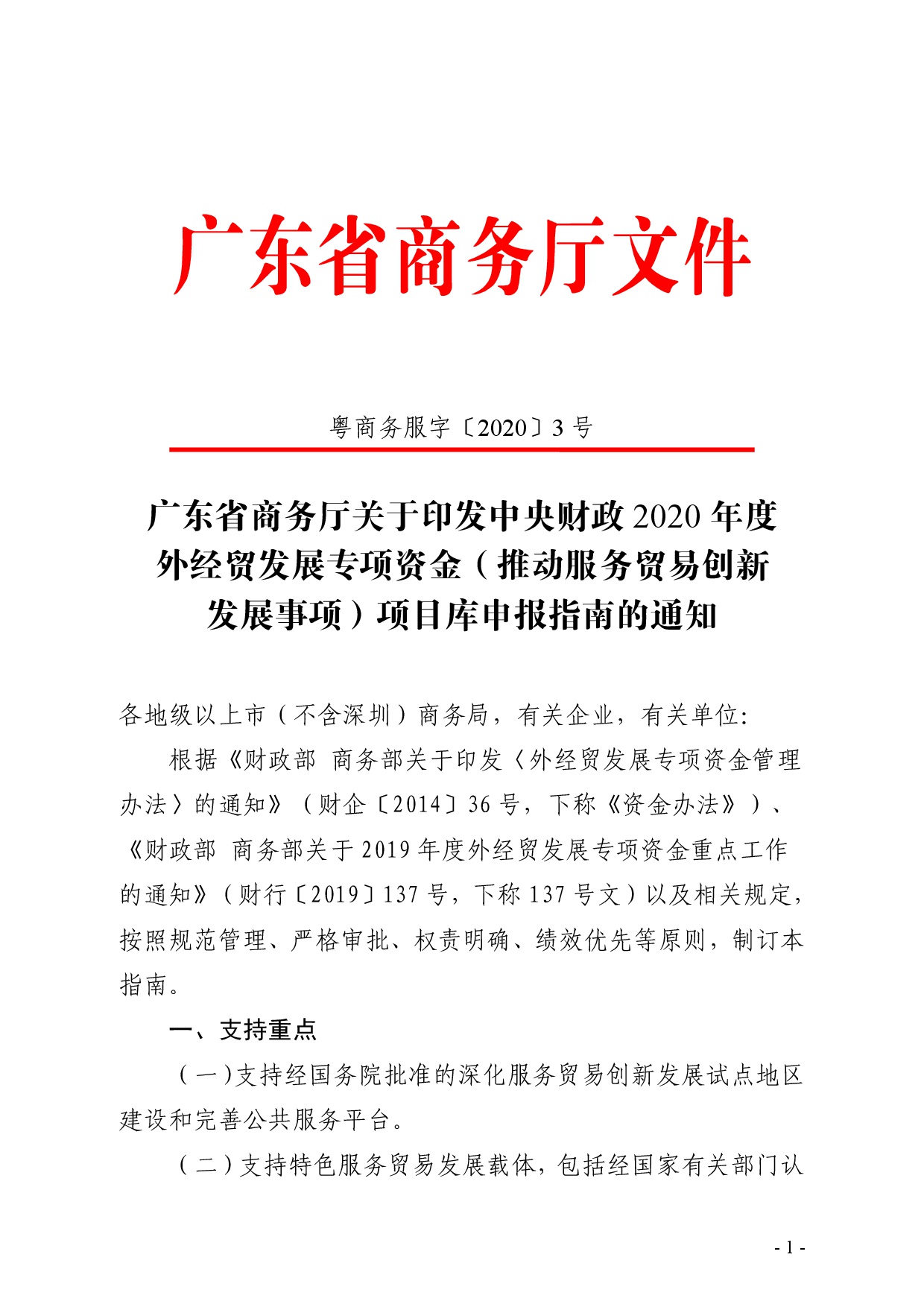 转发 广东省商务厅关于印发中央财政2020年度外经贸发展专项资金(推动服务贸易创新 发展事项)项目库申报指南的通知