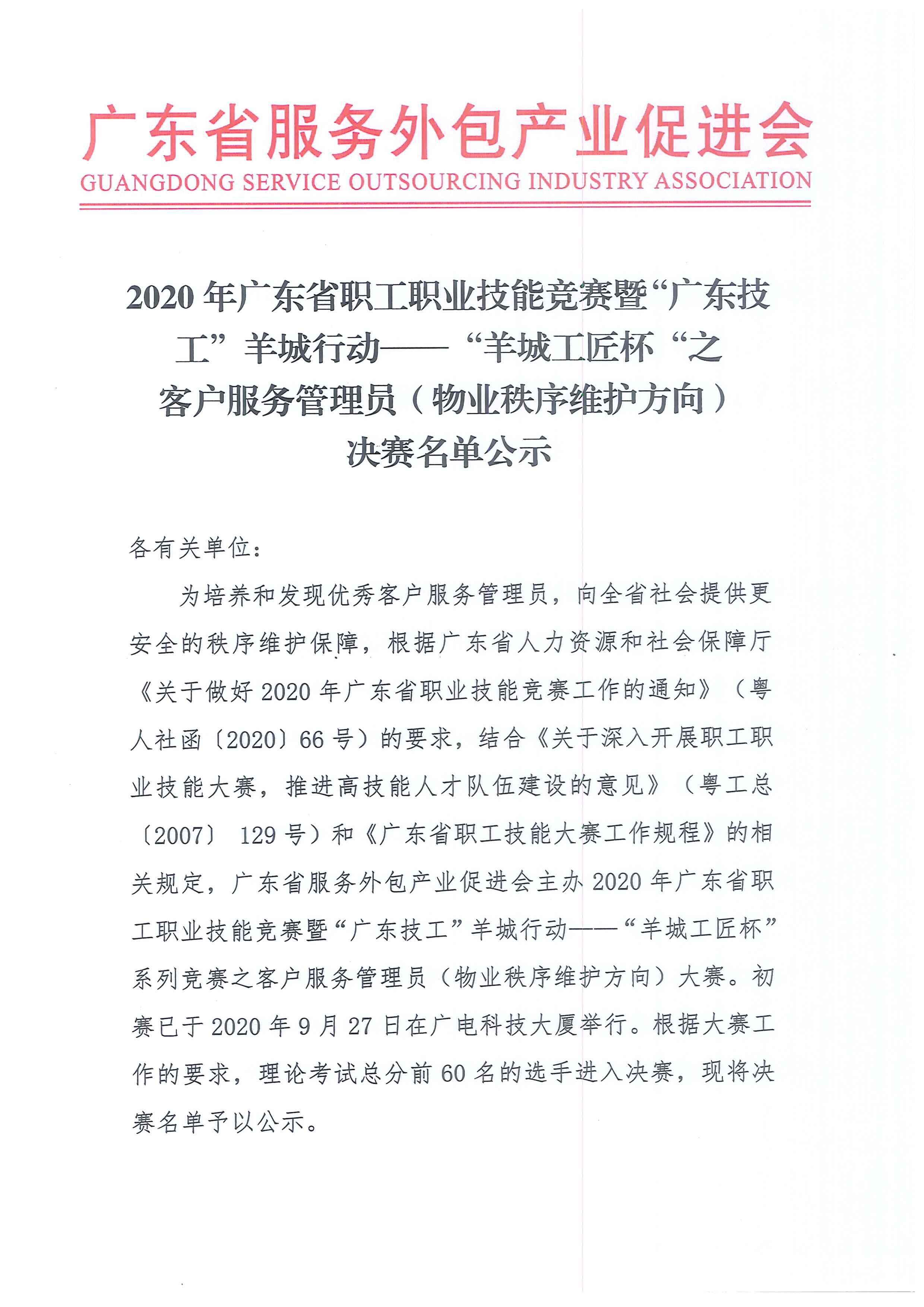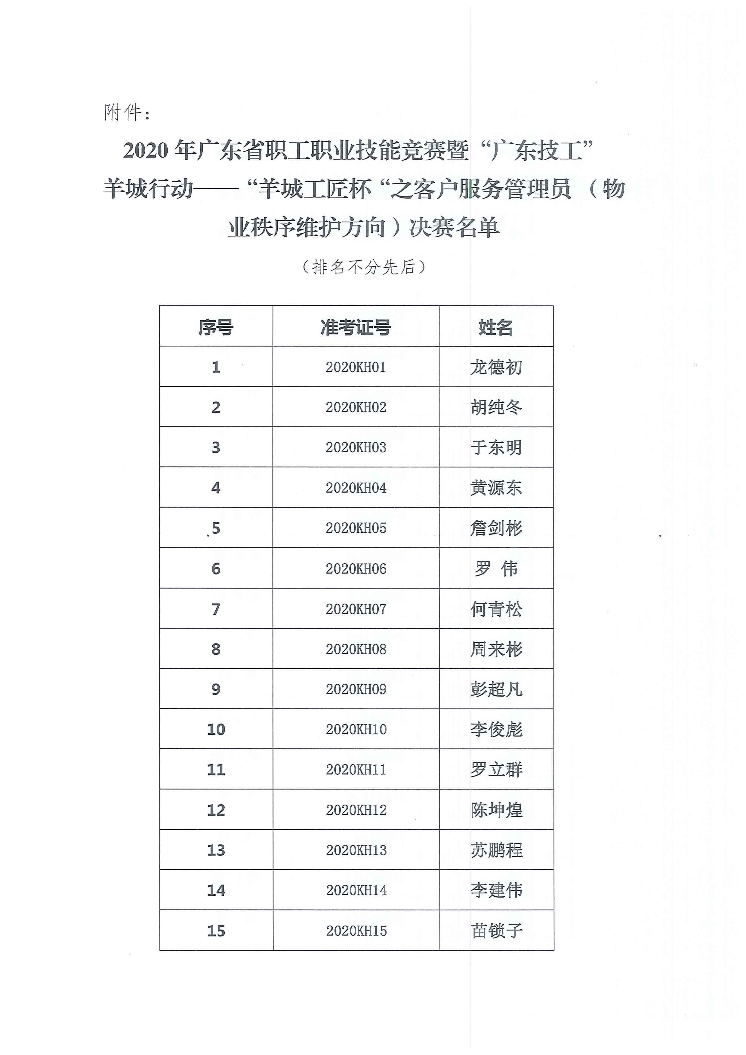 2020年广东省职工职业技能竞赛暨“广东技工”羊城行动——“羊城工匠杯“之 客户服务管理员(物业秩序维护方向) 决赛名单公示