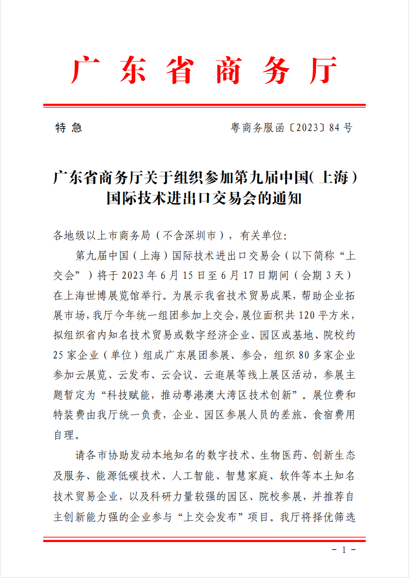 广东省商务厅关于组织参加第九届中国(上海)国际技术进出口交易会的通知