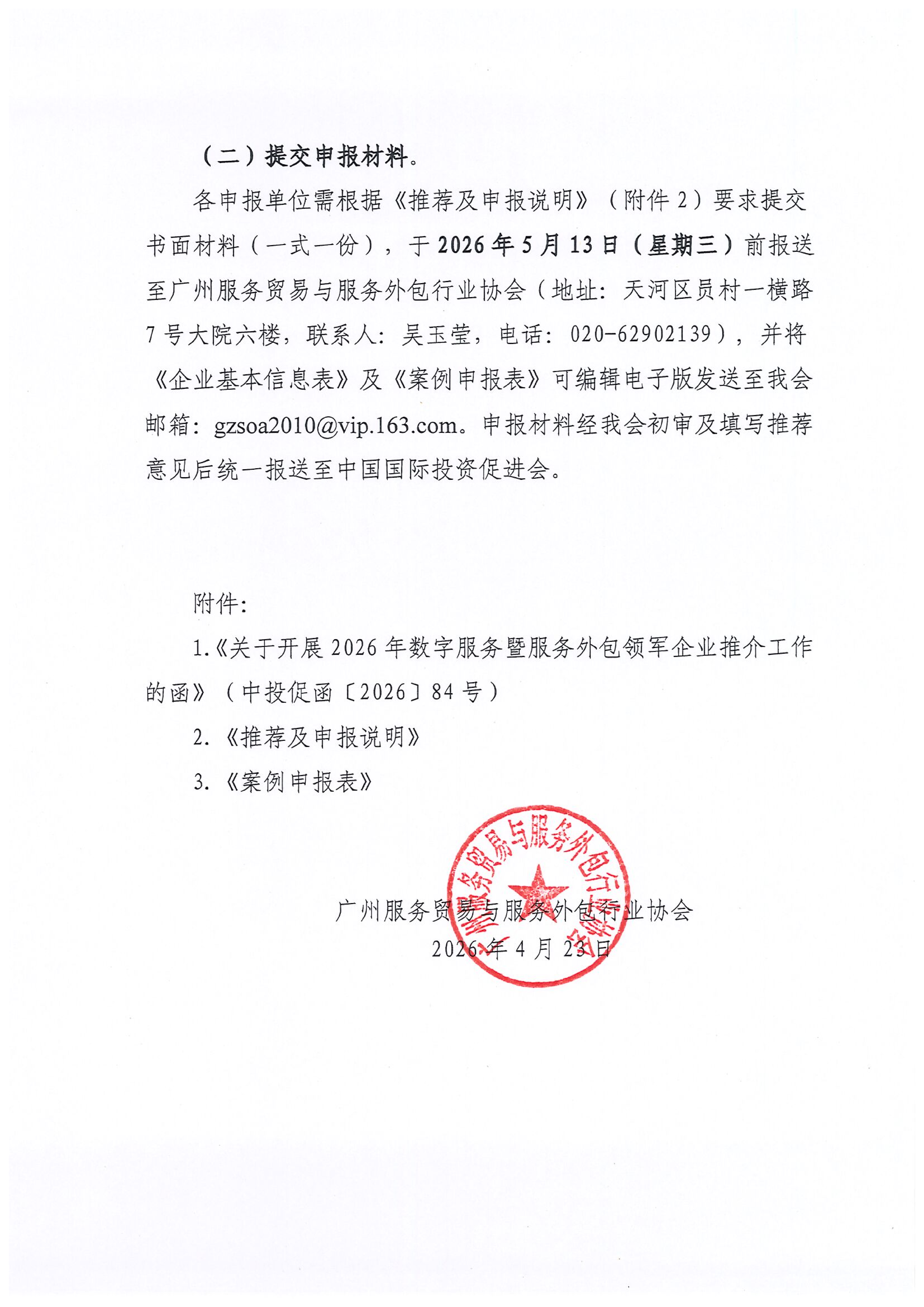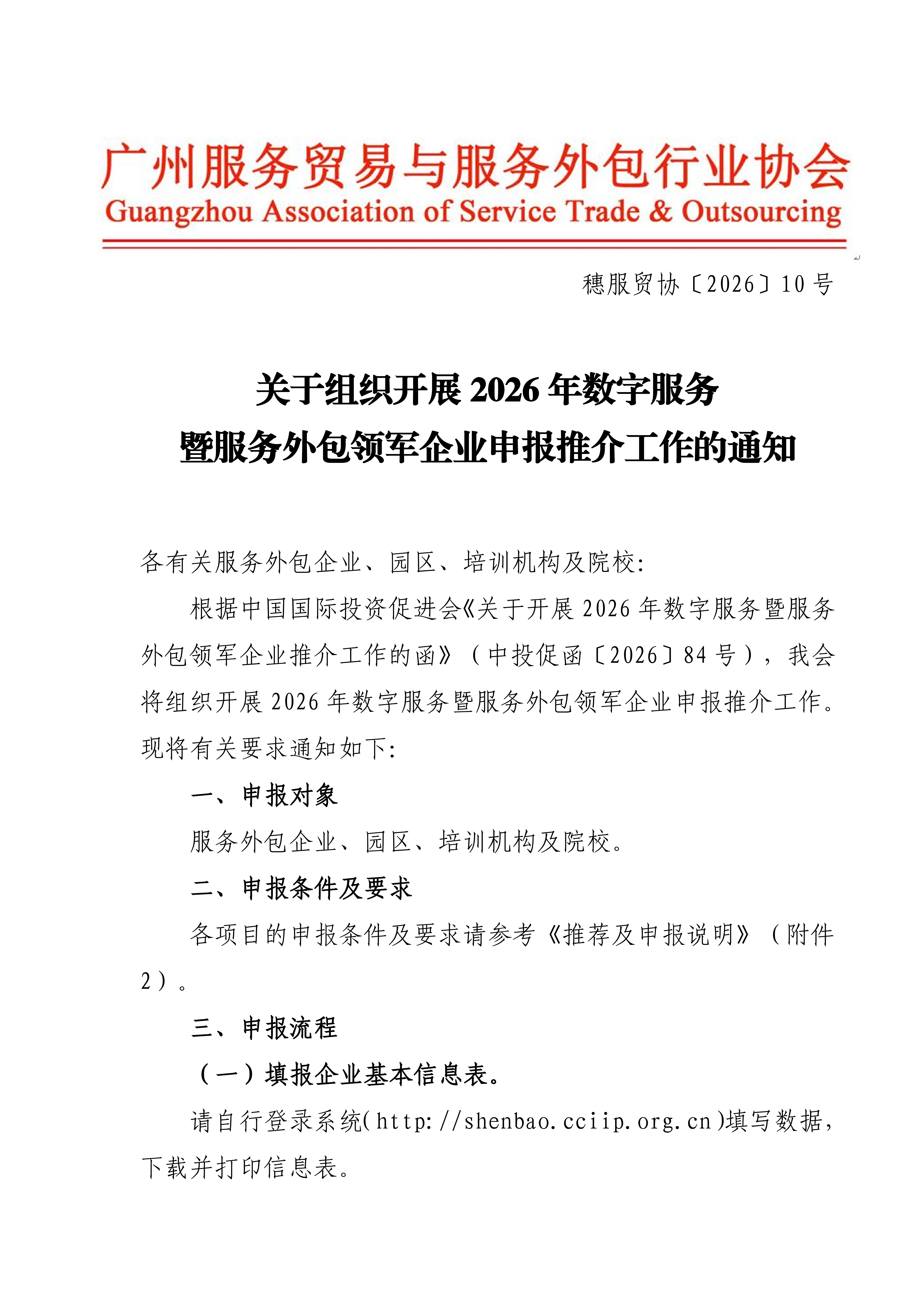 关于组织开展2026年数字服务暨服务外包领军企业申报推介工作的通知